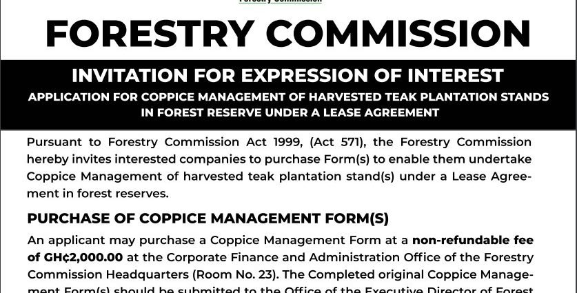 An applicant may purchase a Coppice Management Form at a non-refundable fee of GH¢2,000.00 at the Corporate Finance and Administration Office of the Forestry Commission Headquarters (Room No.23). The Completed original Coppice Management Form(s) should be submitted to the Office of the Executive Director of Forest Services Division, of the Forestry Commission Headquarters (Room No.9), not later than 18th November 2024
